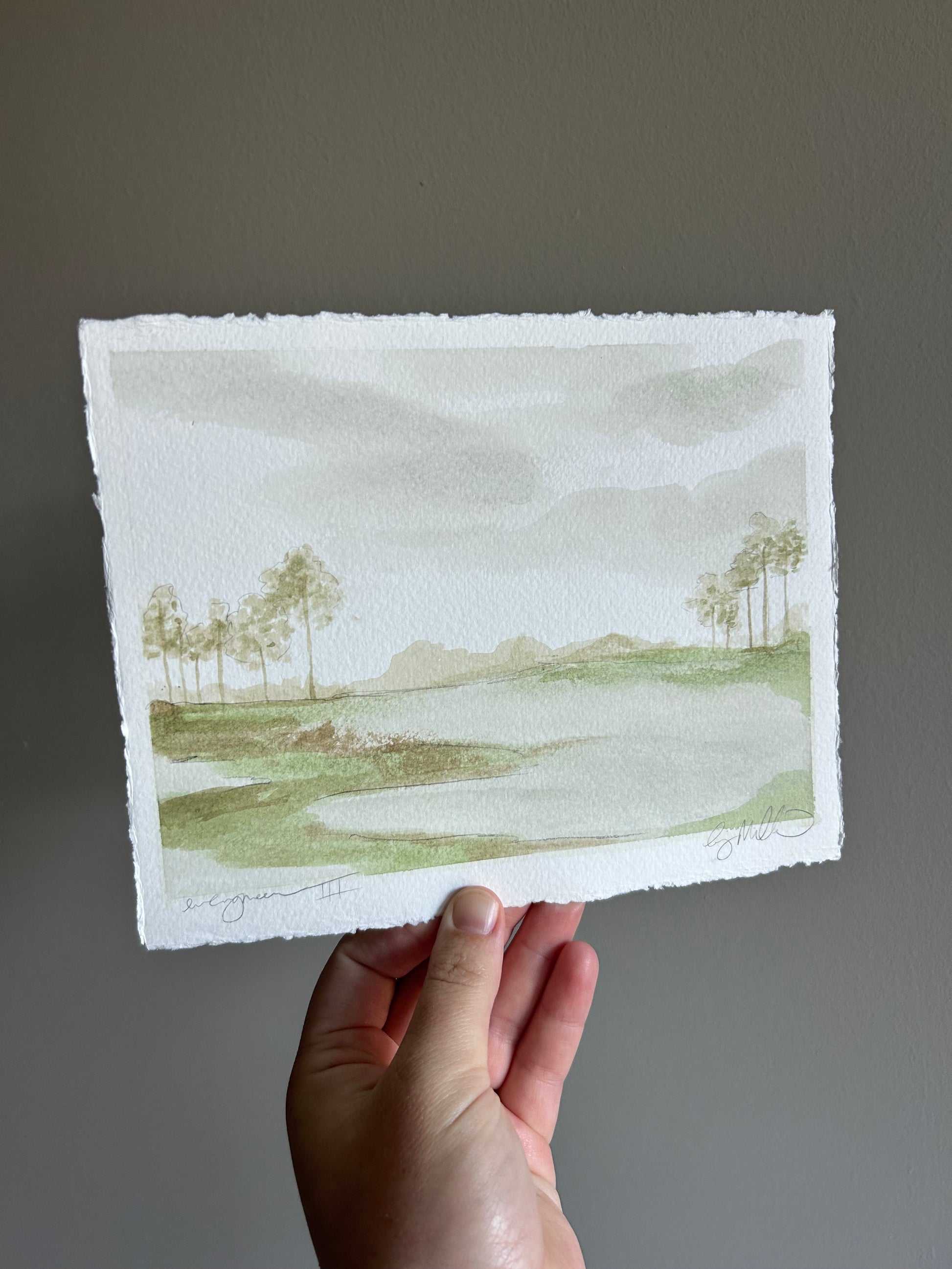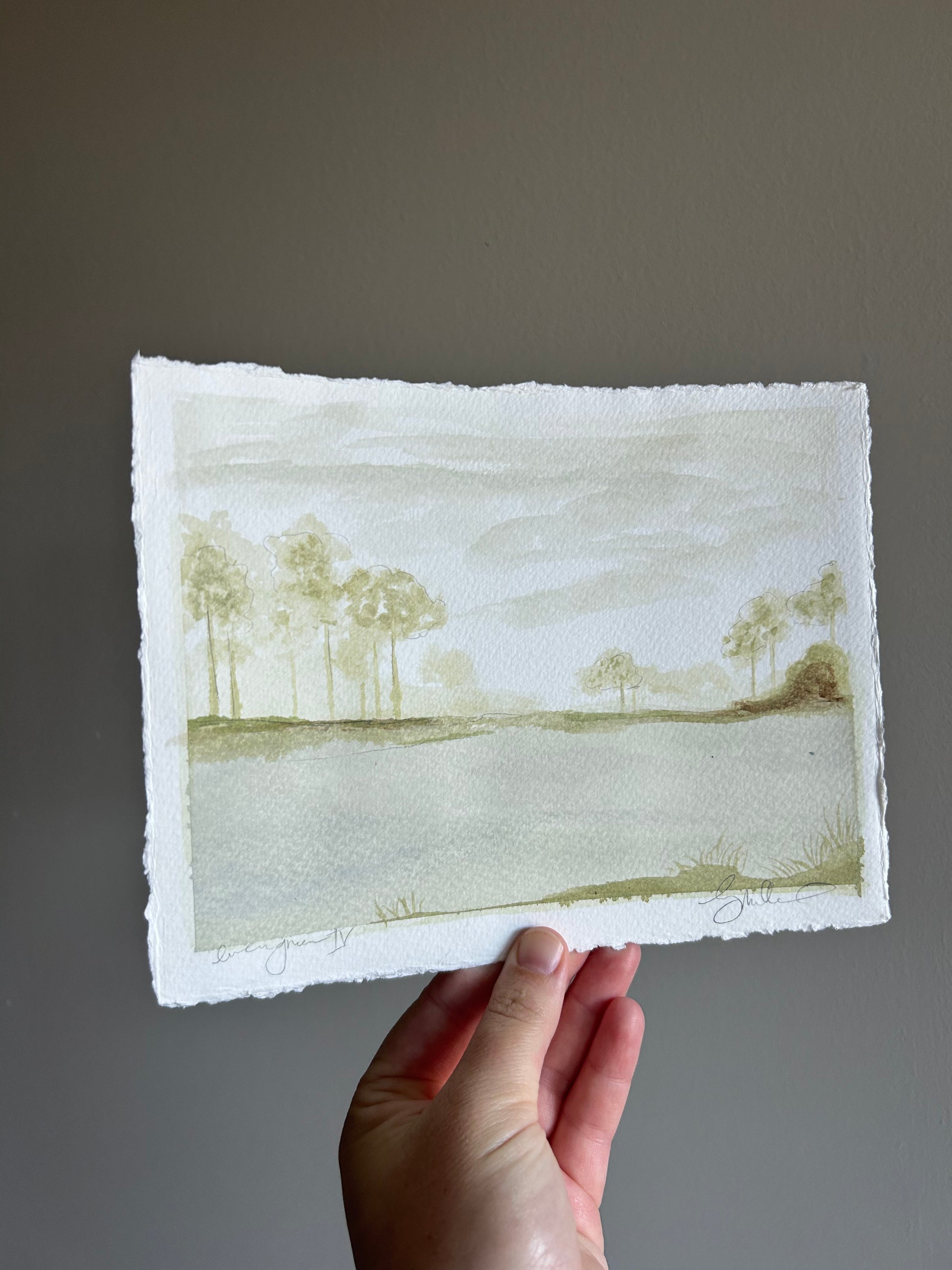 These two serene watercolor landscapes share such a peaceful and ethereal tone soft greens, calm water, and gentle skies. They carry a quiet reminder of God’s presence in stillness, reflecting the peace that comes from resting in His creation.